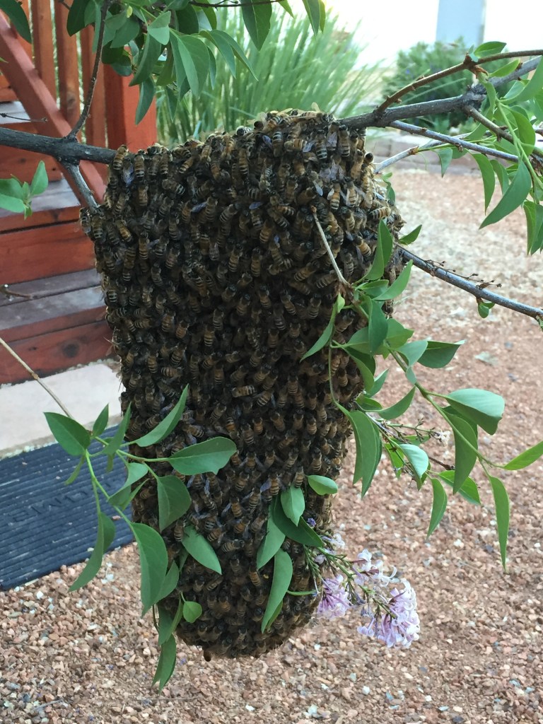 So, if you see a swarm, let a beekeeper, your local beekeeping chapter, or your local Cooperative Extension Service know immediately, before it changes locations, so a beekeeper can attempt to rescue the bees. In Bernalillo Country the swarm number is CABQ switchboard at #311. A local directory of willing swarm catchers is available at http://abqbeeks.org/page/report-a-swarm