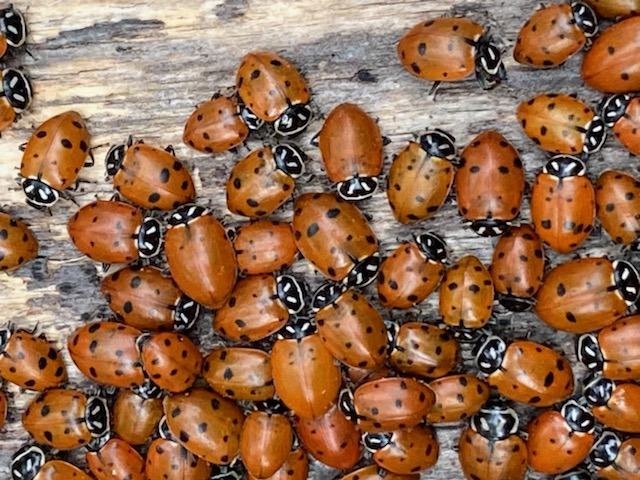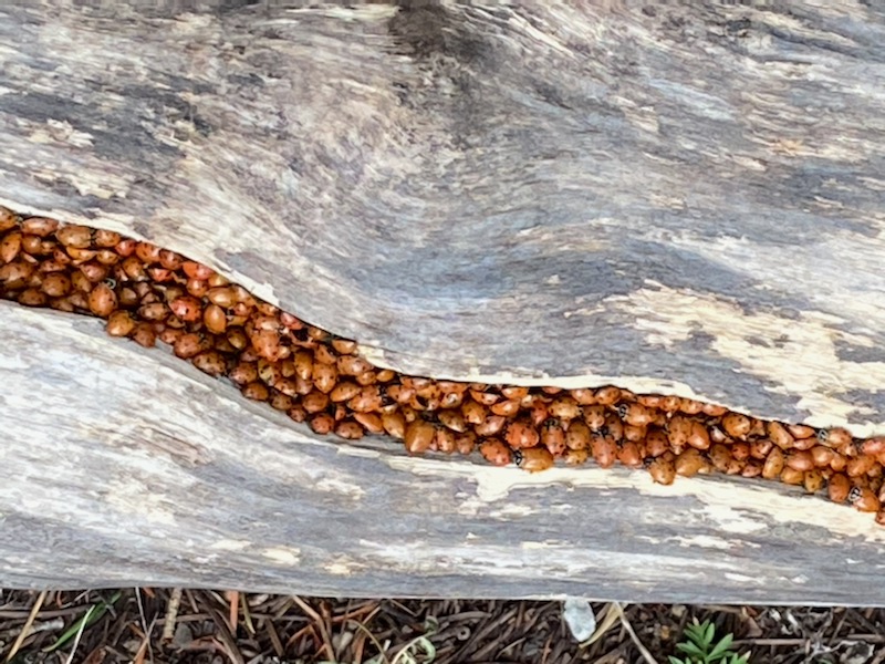 The fore mentioned blog I published last year about ladybugs taught me about something called diapause every winter. As the temps drop they become dormant together en masse.