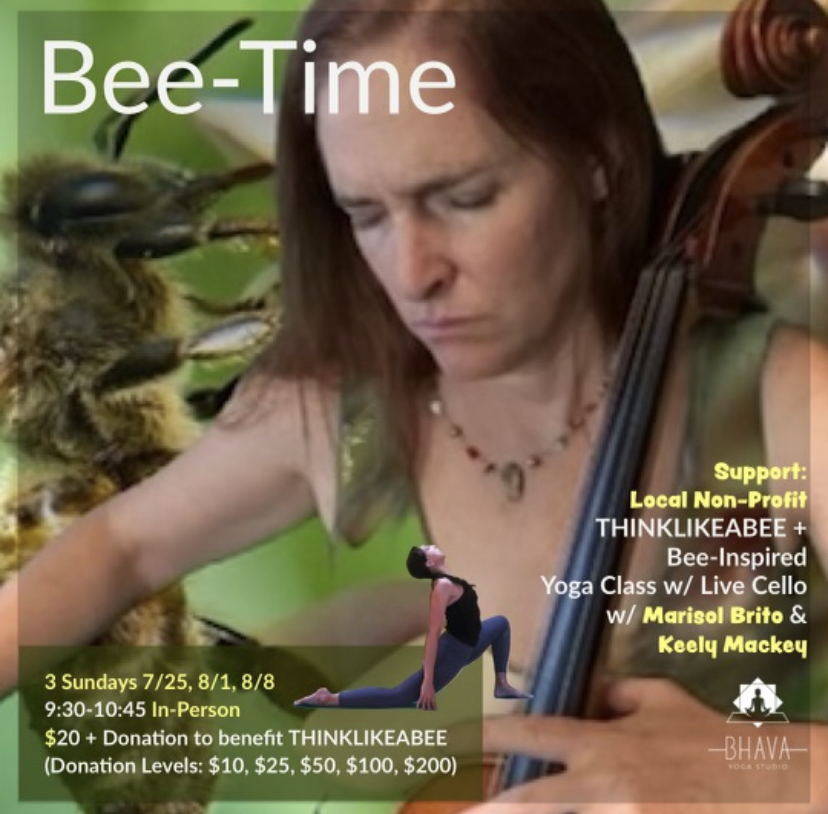 Imagine being able to combine all three into one experience! I am deeply grateful to award winning celloist and composer, Keely Mackey, and Marisol Brito, owner of Bhava Yoga in Albuquerque, for the eclipse of these practices in three consecutive Sunday fundraisers for Think Like a Bee. Next ones coming up, August 1, 9:30am and August 8, 9:30 am at Bhava Yoga Studio.
