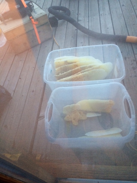 Once in there, one by one, we carefully cut off each long spike of comb, filled with bees and crammed with baby brood and honey/pollen. Darren’s wife meticulously vacuumed the bees off (see the wooden box below with the motor on top) and we carefully stored the fresh golden/white comb in plastic containers. These would be banded to frames later and hung in a new hive.